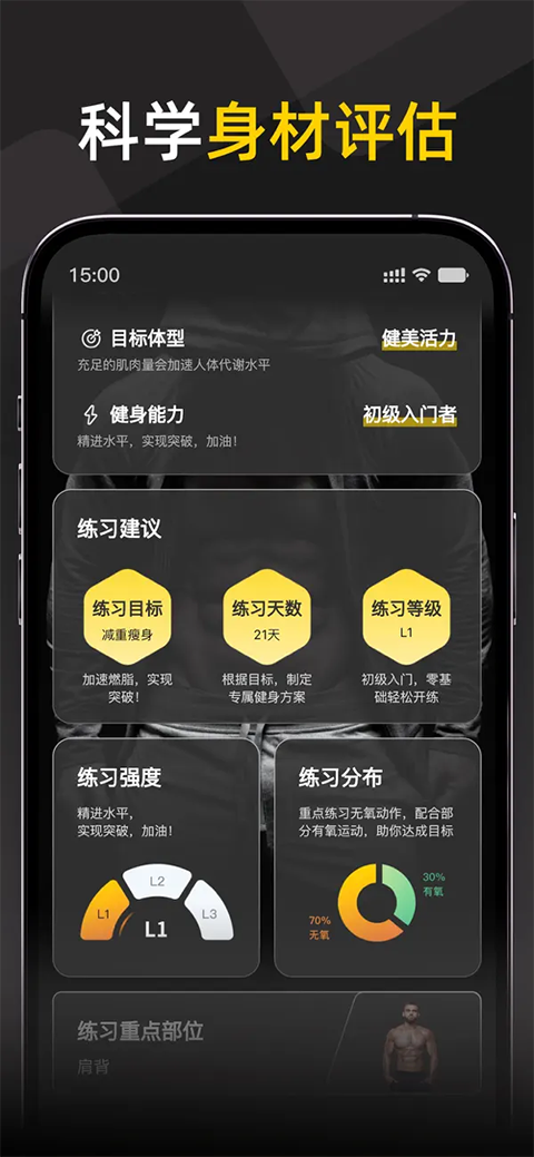 1、无论你的目的是增肌、减脂还是塑形,硬汉健身app都能设计出属于你的最佳训练计划。