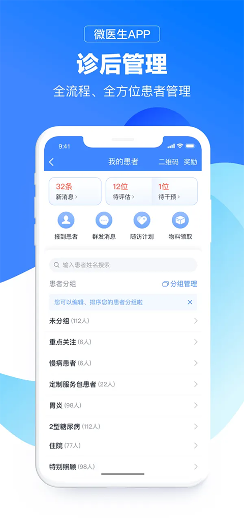 医生可以对预约挂号、咨询和患者报到的患者进行标记备注分组和诊后随访跟踪病情;
